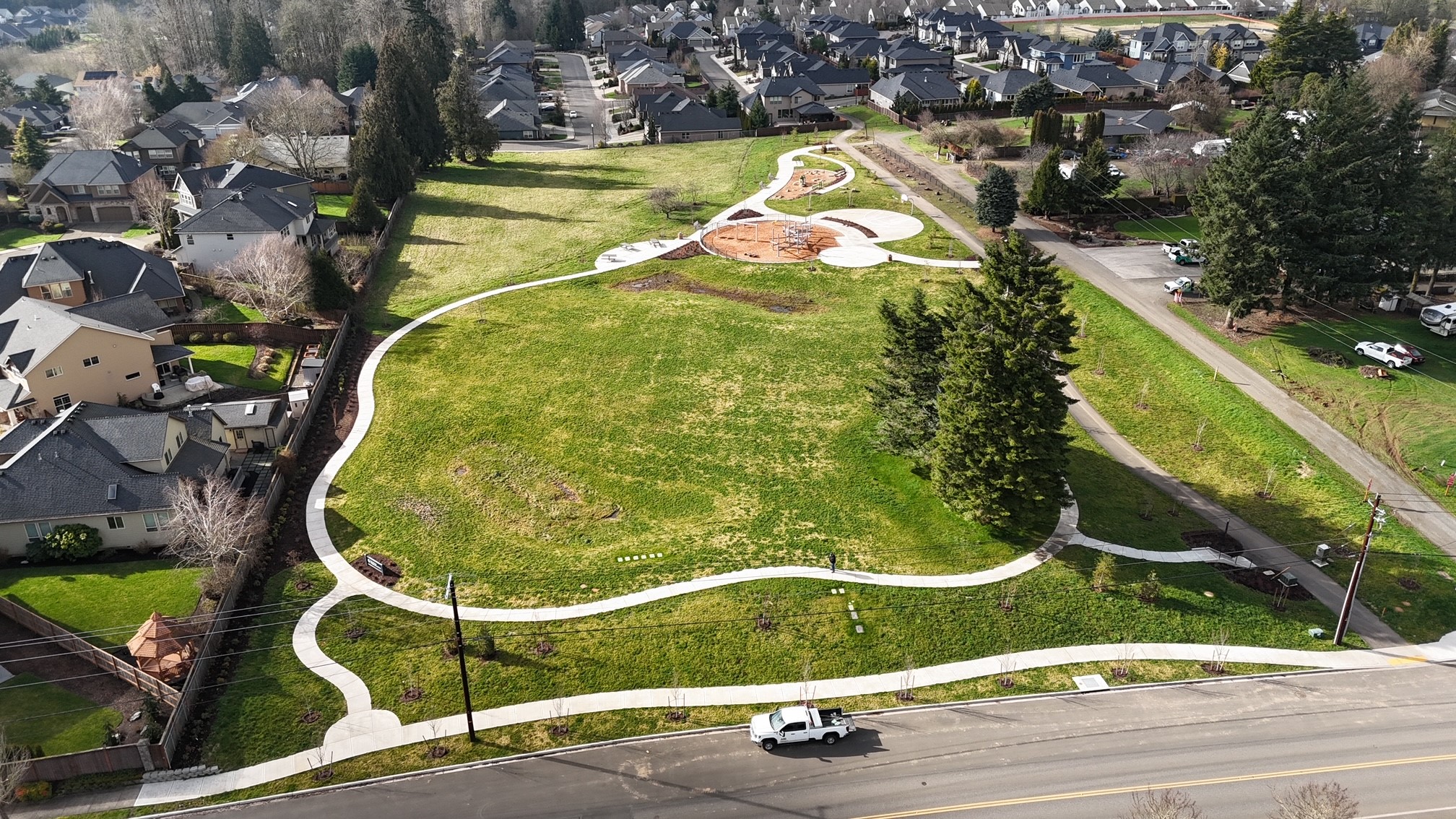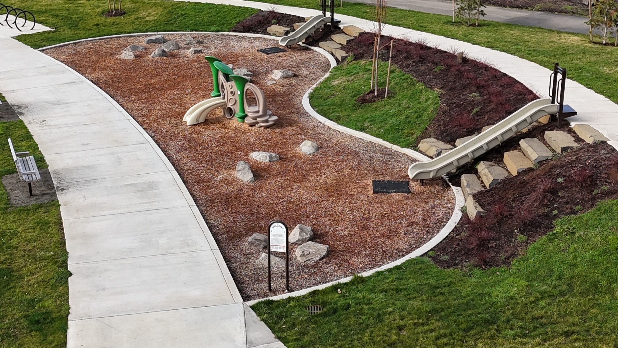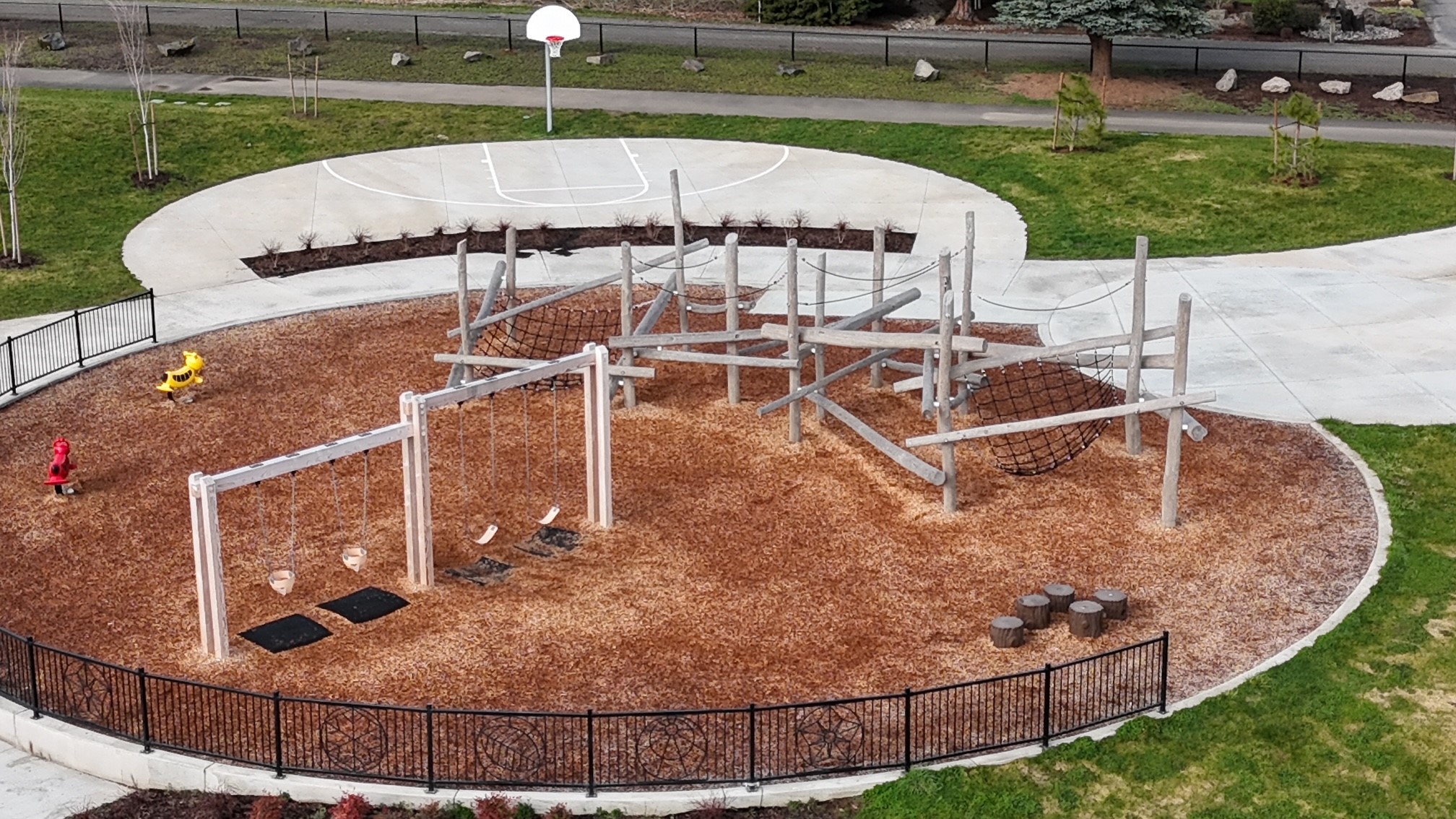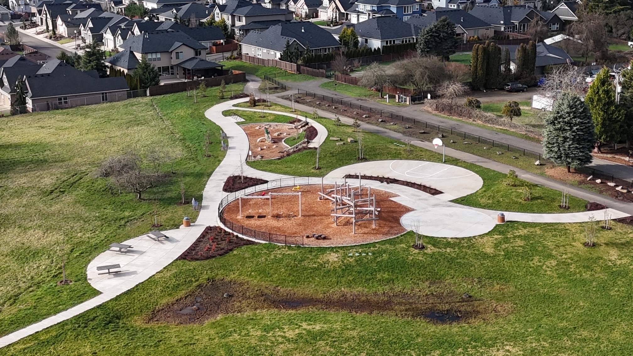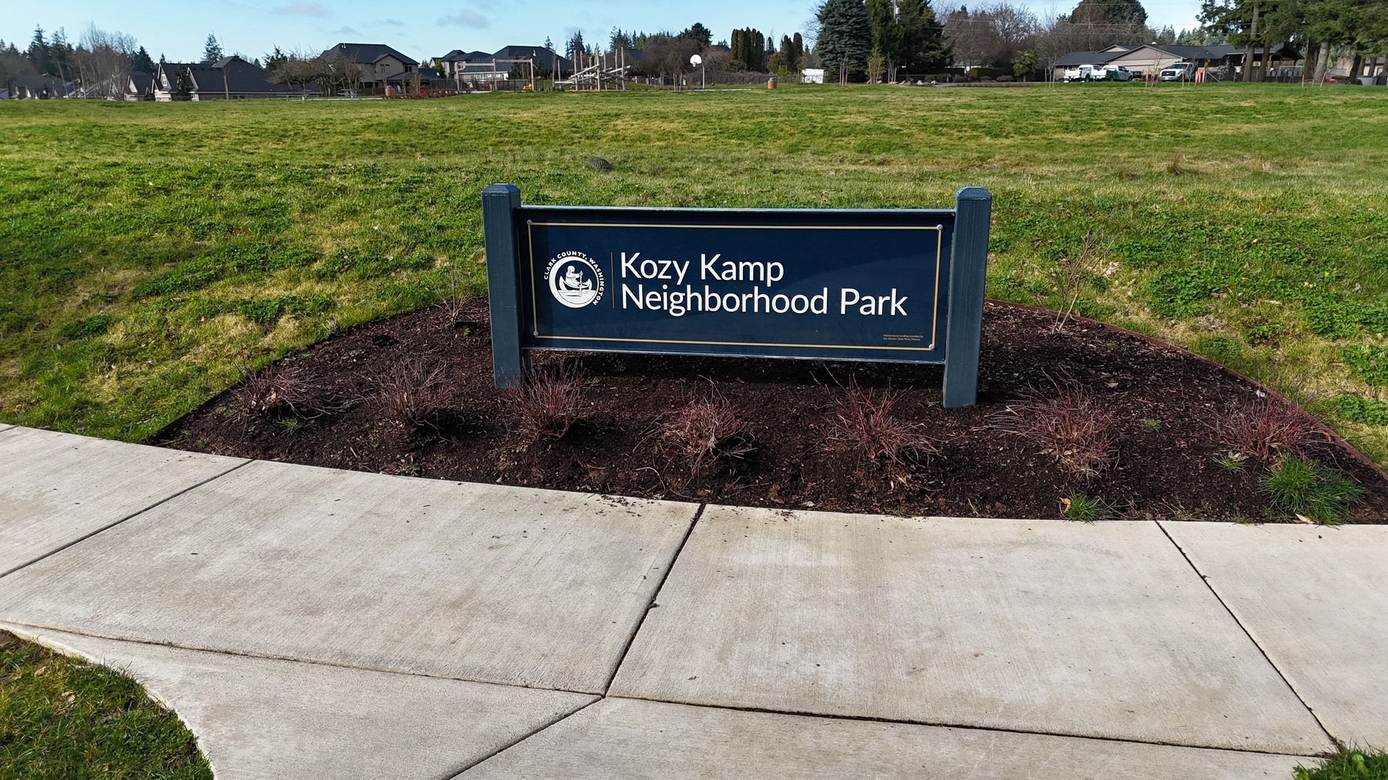 The construction of Kozy Kamp included excavation and grading, erosion control, vegetation removal, grubbing, curb and gutter; concrete curbing, play equipment site furnishings, drainage structures, electrical utilities, irrigation, landscaping and seeded lawns.