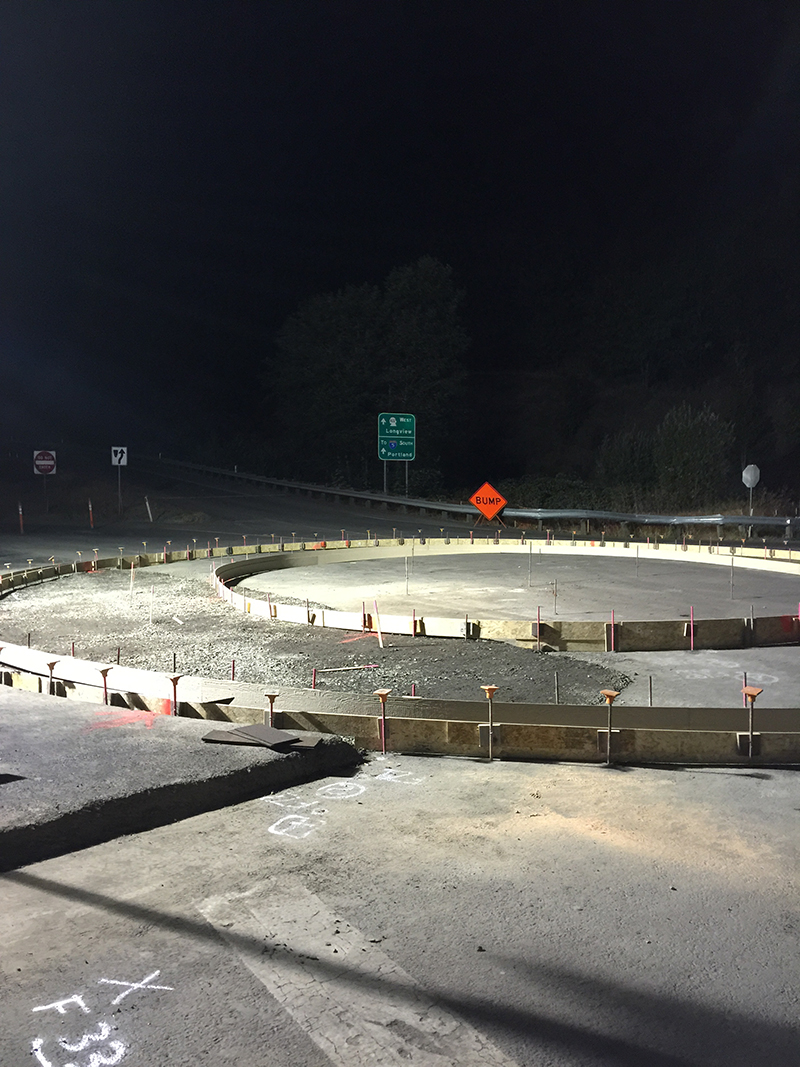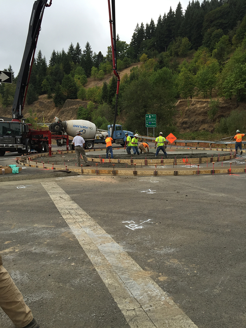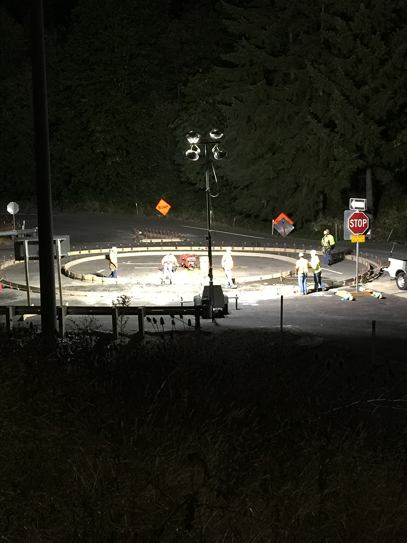 The 20-working day job was done in 5 days which included the compact roundabout, concrete splitter island, drainage modifications, surfacing, paving, permanent signage and erosion and traffic control.